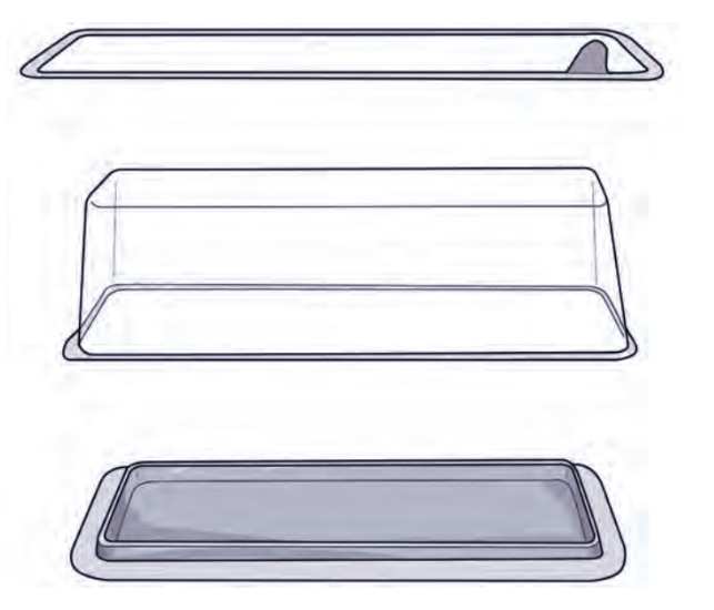 De basis van de Visiopaq® heeft een opstaande rand die ervoor zorgt dat er geen vocht uit de plastic verpakking lekt. En maakt het mogelijk om de plastic bovenkant er strak omheen te plaatsen. De papieren rand wordt op de rand van de tray gelijmd, waardoor de Visiopaq® hermetisch wordt afgesloten. Deze verzegeling is identiek aan die van klassieke dekselfolie.